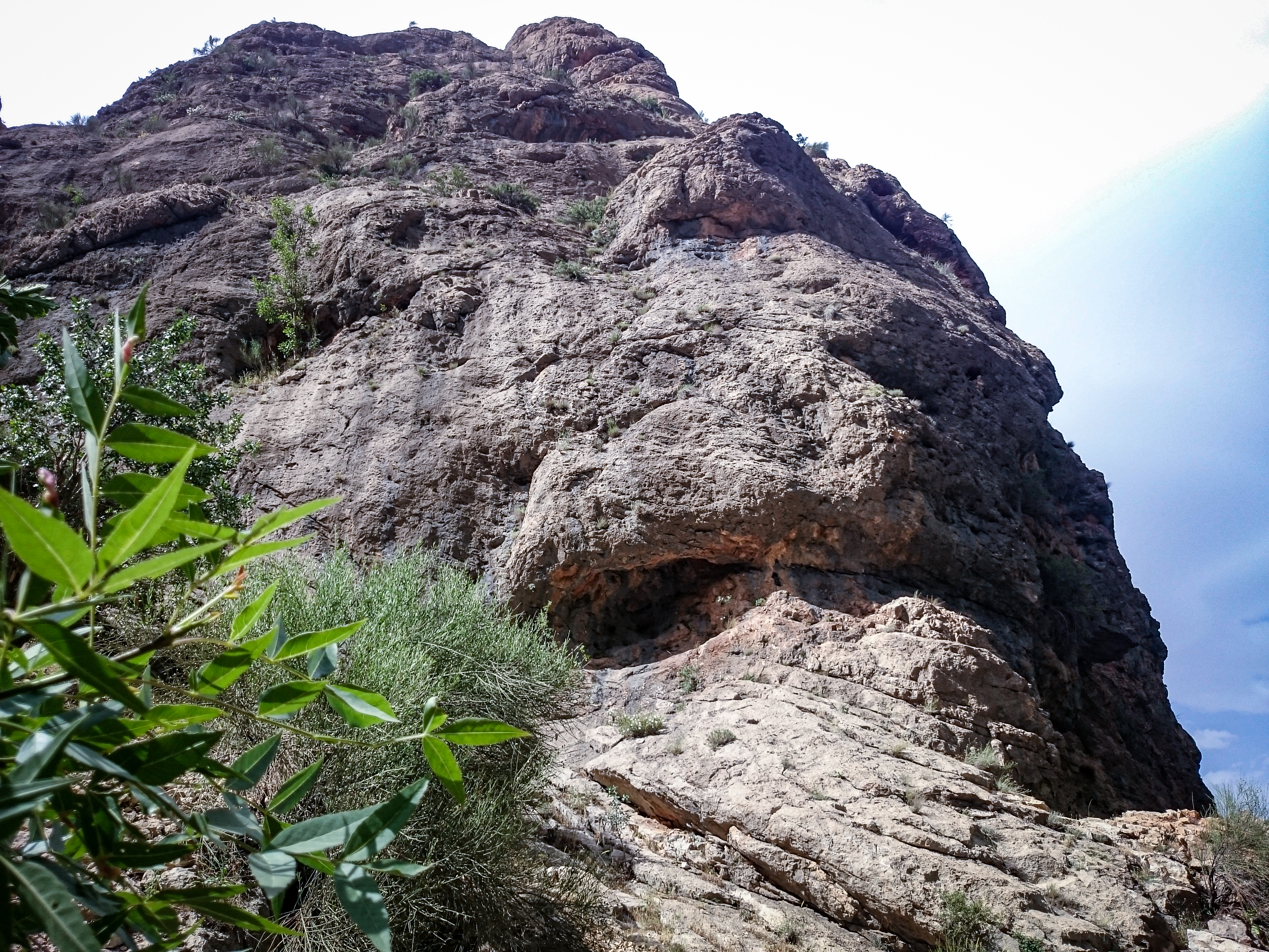 This photograph, taken from a low perspective, emphasizes the towering height and textured, layered geology of a large cliffside. The harsh sunlight highlights the cracks and crevices of the brownish-grey rock. In the bottom-left corner, vibrant green bushes provide a soft contrast to the hard rock, framing the scene. A small patch of pale sky is visible in the upper right.