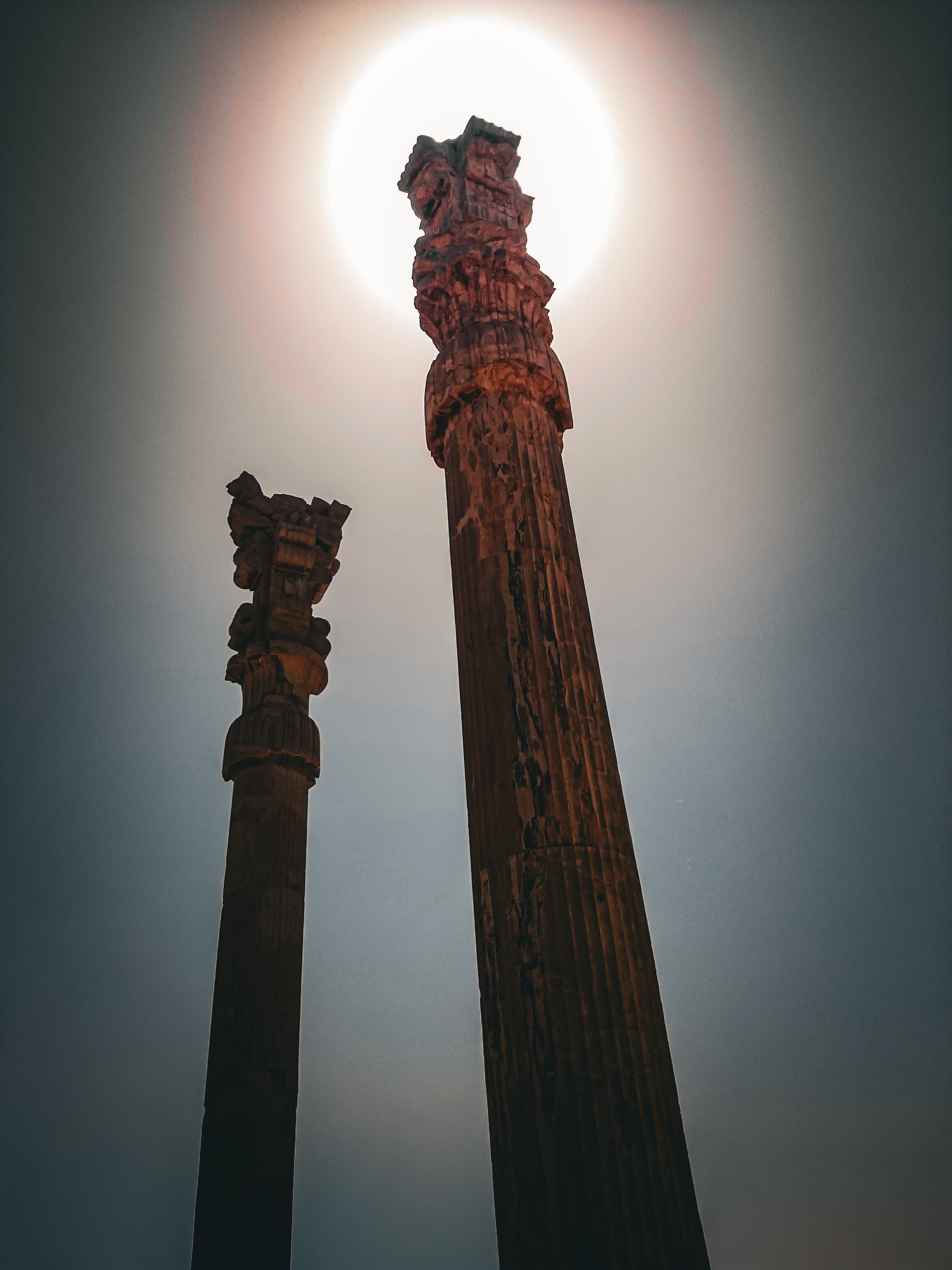 Close-up silhouette of an ancient column capital at the Gate of Nations. The sun flares brightly from behind, creating a glowing halo effect around the top of the column.