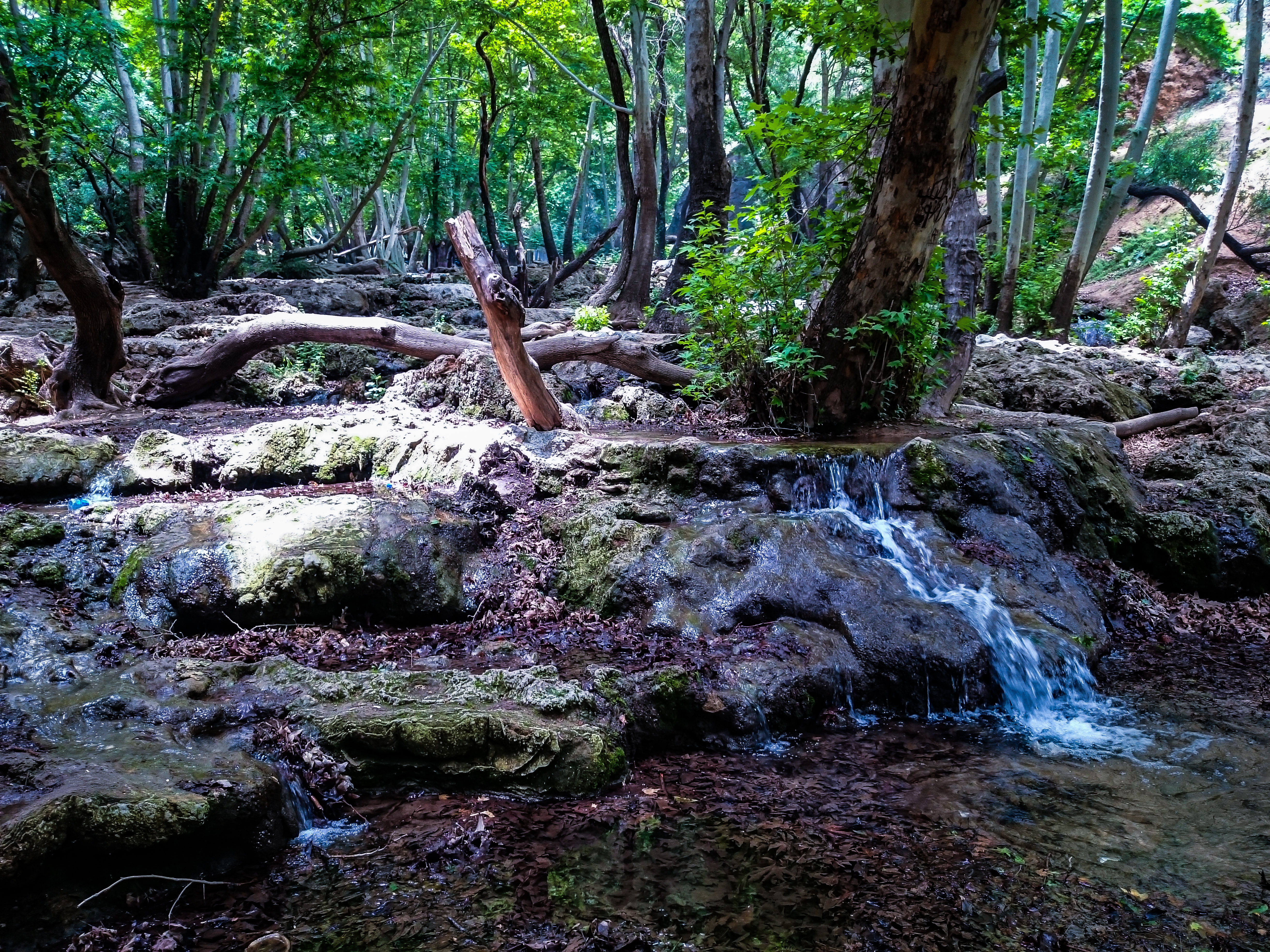 Sunlight breaks through the dense canopy of the Lost Paradise forest, illuminating a small, lively stream. The water flows over rugged, moss-covered rocks, creating a gentle cascade that contrasts with the dark, damp leaves on the forest floor. The scene is filled with the deep greens of the foliage and the sturdy trunks of ancient trees rising in the background.